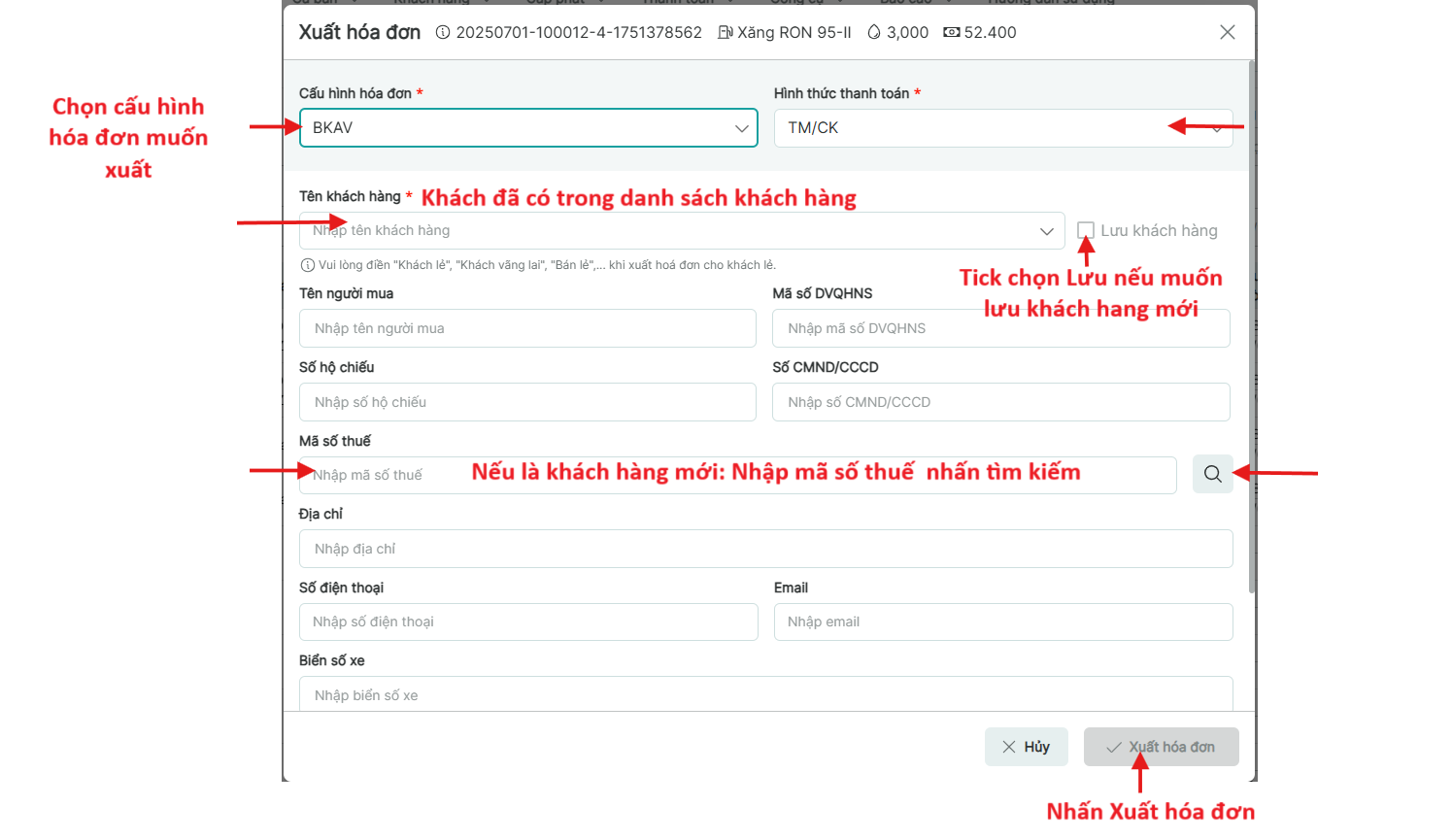 Nhập thêm thông tin cần thêm và Nhấn Xuất hóa đơn