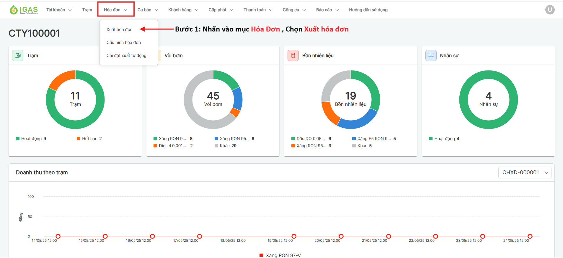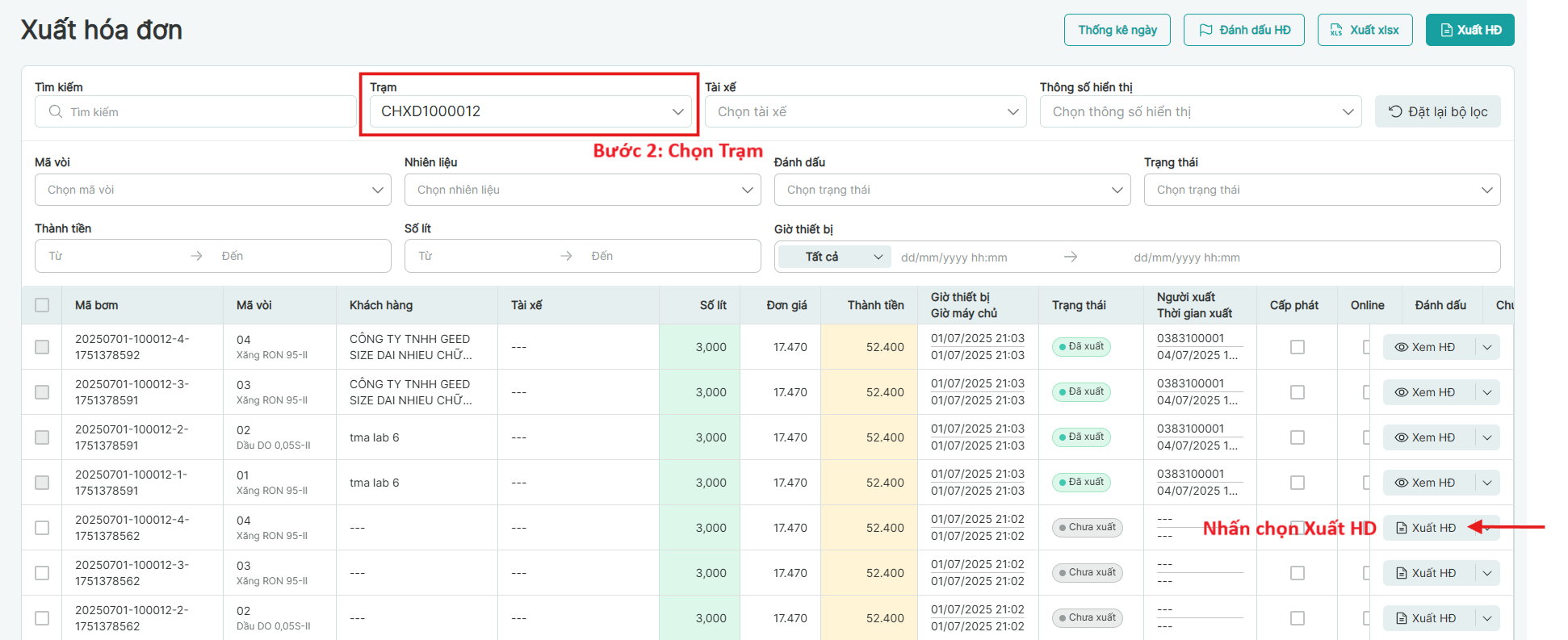 Bước 2: Chọn [Trạm] và lọc mã bơm theo các chỉ số mong muống. nhấn vào [Xuất HD]