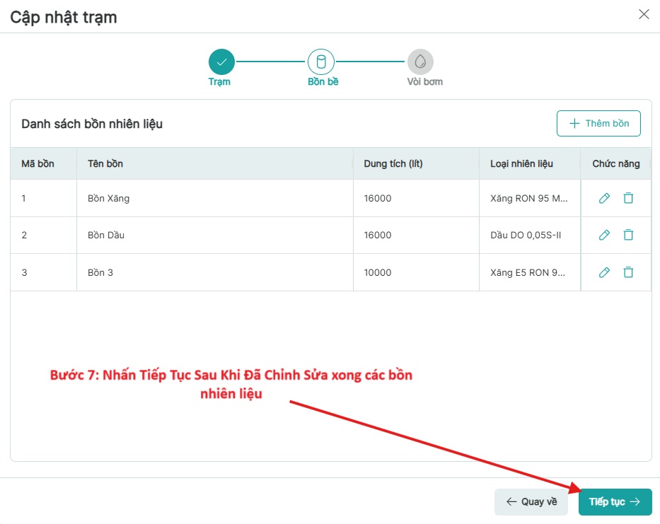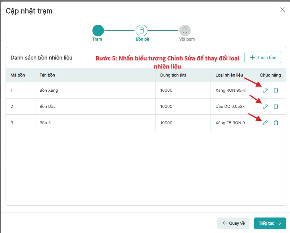 Bước 5: Nhấn biểu tượng Chỉnh Sửa từng bồn nhiên liệu