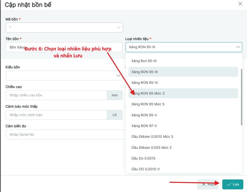 Bước 6: Chọn loại nhiên liệu tương ứng và nhấn Lưu: